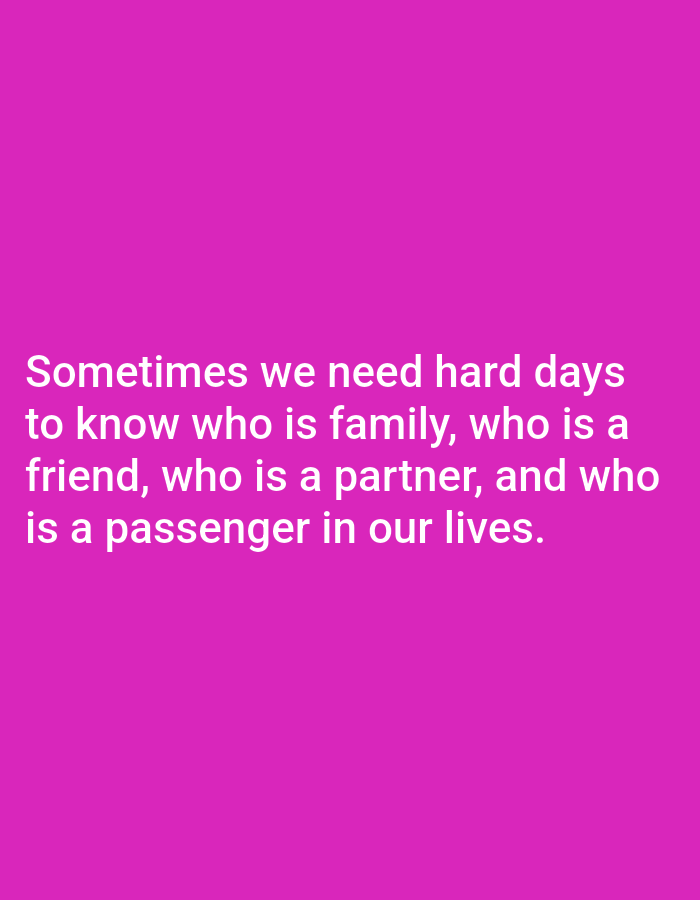 The image displays white, sans-serif text against a solid magenta background. The text is horizontally and vertically centered, occupying the lower half of the frame. The complete text reads: "Sometimes we need hard days to know who is family, who is a friend, who is a partner, and who is a passenger in our lives." No people, discernible objects other than the text, or actions are depicted. The environment is an abstract, plain magenta field. The image does not contain any visual information to indicate a specific physical location in the city of Ogidi, Nigeria, or any other geographical area.