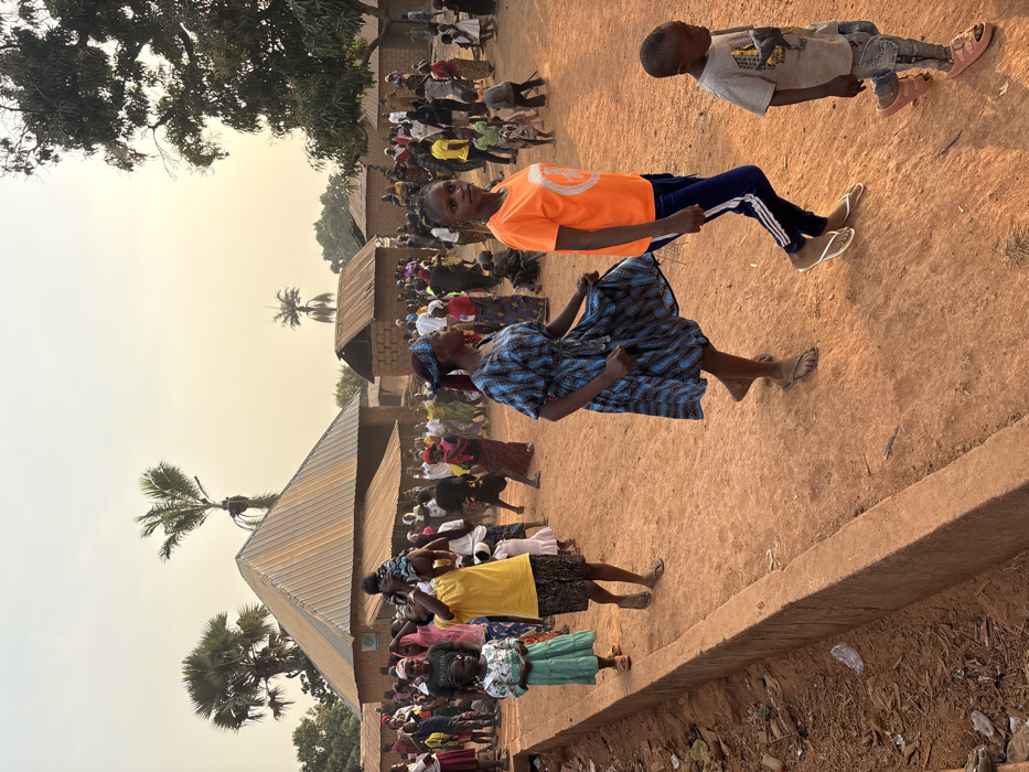 A bustling outdoor scene features a crowd near modest buildings with corrugated roofs and palm trees. In the foreground, a few individuals stand out: a girl in an orange shirt and navy pants, a woman in a patterned blue dress, and other children in bright clothing. They are positioned on a dirt path or plaza beside a concrete ledge. The overall atmosphere suggests a festive gathering or community event. The lighting indicates it is likely early morning or late afternoon.
