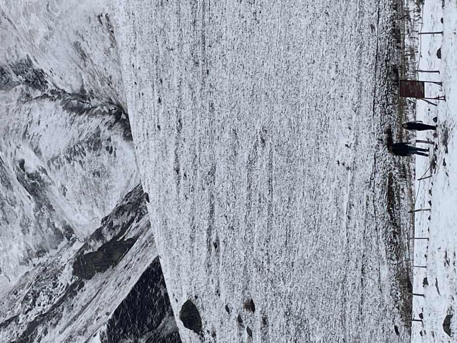 This image depicts a snow-dusted mountainous landscape in the vicinity of Juta, Georgia. In the foreground and midground, a gently sloping terrain is covered with a thin layer of white snow, revealing underlying darker ground and sparse vegetation. The background features steep, rugged mountains, partially covered in snow with exposed dark rock faces and visible erosion channels. In the lower right, two individuals are standing on the snow. The person on the left is taller, dressed in a dark winter jacket and dark pants, facing slightly right. To their right and slightly forward is a second, shorter individual in dark clothing, also facing right. Immediately to the right of these individuals, a dark rectangular sign on a post is visible, its text unreadable. A rudimentary barrier or pathway marker, consisting of short wooden posts connected by a rope or wire, runs horizontally across the lower foreground. The sky is overcast, providing diffuse lighting.