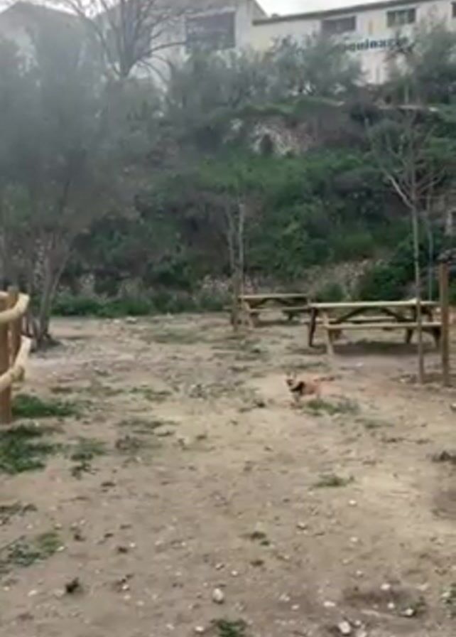 small, light-brown dog with a dark harness, standing in a dirt-covered park. In the background are three wooden picnic tables, scattered bare trees, and a low hill covered in green plants and foliage, with a building at the top. The sky appears cloudy. The dog is focused on an orange ball on the ground in front of it.