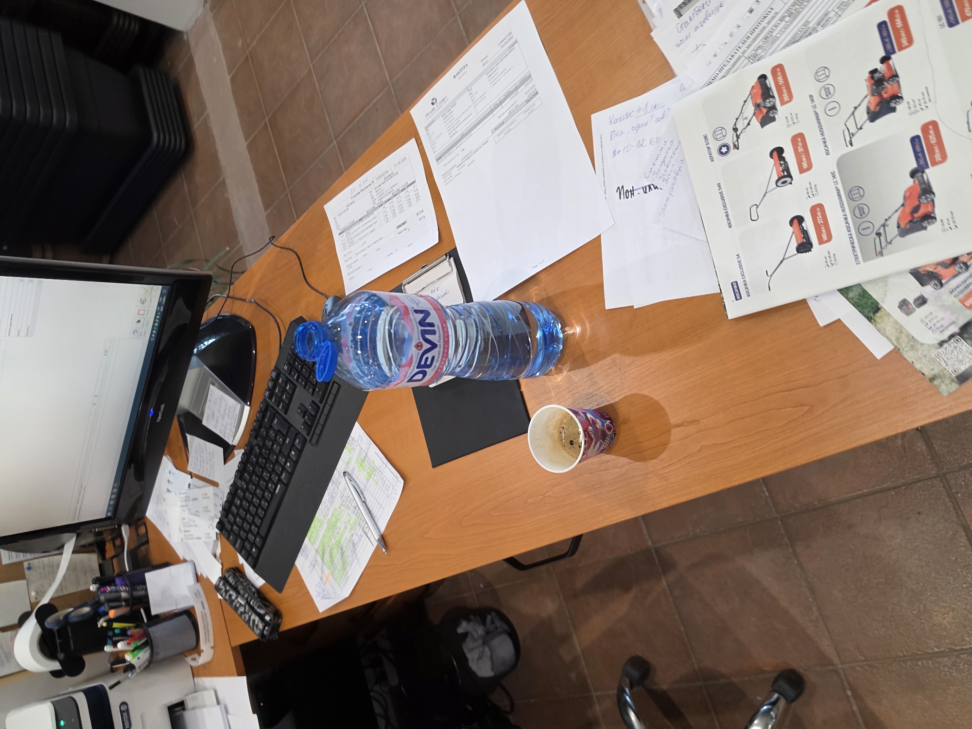 cluttered desk in an office setting. On the desk are a computer monitor, keyboard, mouse, a bottle of "Devin" brand water, a disposable coffee cup with the remnants of coffee, various papers including invoices, a notepad with handwritten notes, a pen, and a brochure for lawnmowers ("Kocacka"). There are also writing utensils in a container and a printer. The OCR text on one invoice suggests the company "Yanak Soft" is involved. Other text mentions quantities like "4-8 се" and colors like "Бял, черен? сив?", suggesting ordering information. There's reference to "Стамболи этом язовира," likely referring to Стамболийски, which is a municipality in Bulgaria. The reference to "Haskovo" comes from the brand Devin which has a factory and source of water in Haskovo, Bulgaria. The flooring appears to be tiled. Part of an office chair is visible beneath the desk. There are stacks of black items, which appear to be plastic storage containers, in the background to the left.