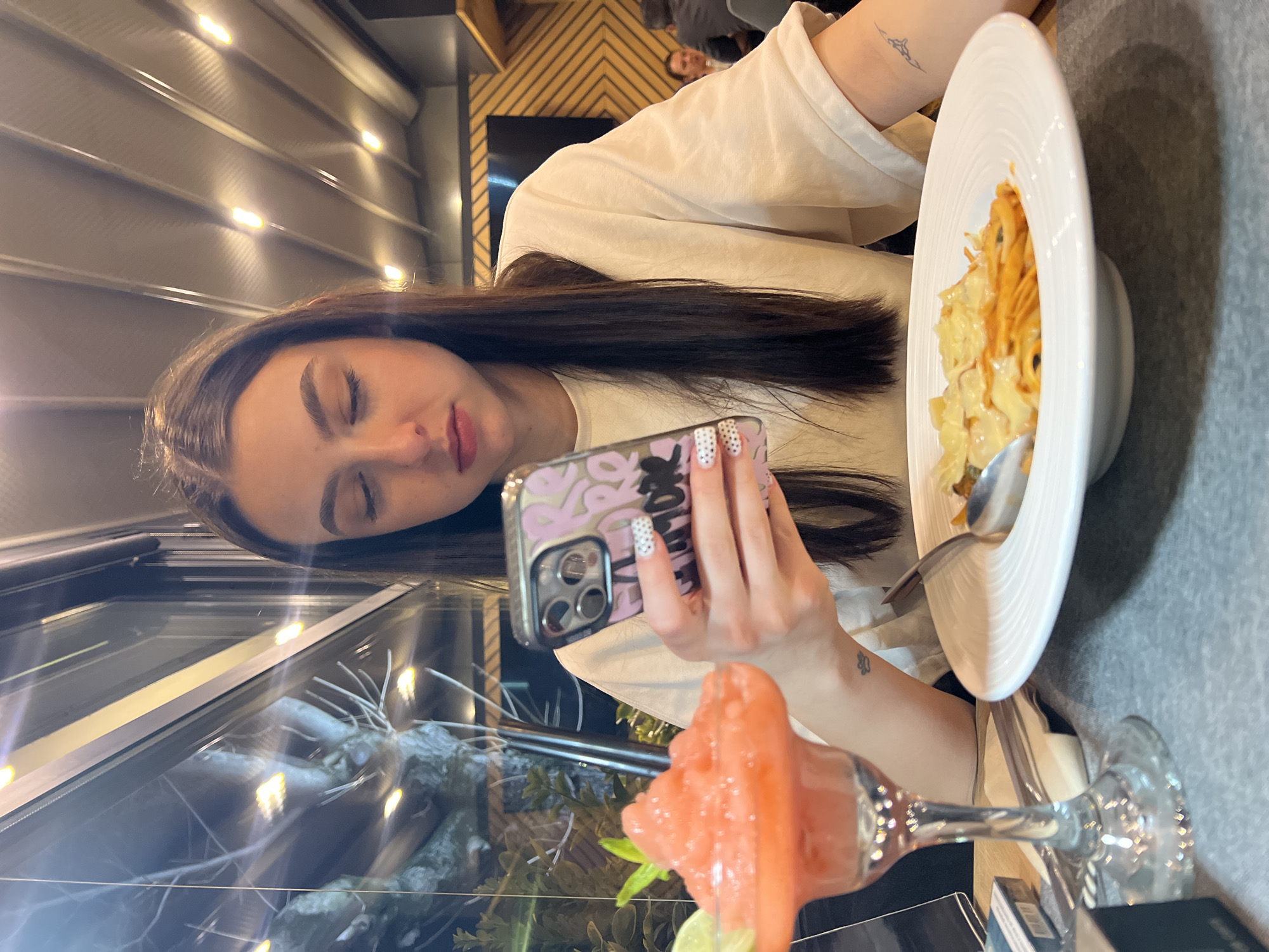 A young woman with long dark brown hair and wearing a light-colored t-shirt sits at a table in an indoor dining establishment in Sofia, Bulgaria. She is focused on a silver-colored smartphone, held in both hands, featuring a light pink case with dark lettering. Her left inner wrist bears a small crown tattoo, and her right forearm has an abstract tattoo. Her fingernails are adorned with white and black polka dots and black and white patterned designs. On the dark gray, textured table in front of her is a white, fluted plate containing pasta with a red sauce, topped with melted white cheese. A spoon rests in the plate. To the left, a tall, stemmed glass holds a vibrant orange/pink frozen slushie drink, garnished with a lime wedge and mint leaves. Adjacent to the drink, a blue and white L&M cigarette packet and a black rectangular object, likely an ashtray or coaster, are visible. Cutlery and a white napkin are also present on the table. The background reveals a modern restaurant or cafe interior with large glass windows to the left, reflecting interior lights and showing blurred outdoor greenery. The ceiling is light-colored and ribbed, fitted with several rectangular lights. A patterned wooden wall with diagonal strips is visible further back, along with blurred figures of other patrons dining in the establishment.