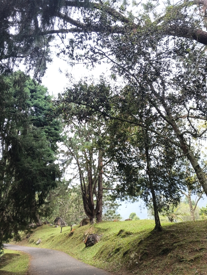 A winding asphalt road cuts through a lush, green landscape. Trees of varying heights and types line the road, some casting shadows on the grassy slopes. Moss-covered rocks dot the terrain. The sky is overcast, filtering light through the dense foliage. A small structure is visible in the distance amidst the greenery.
