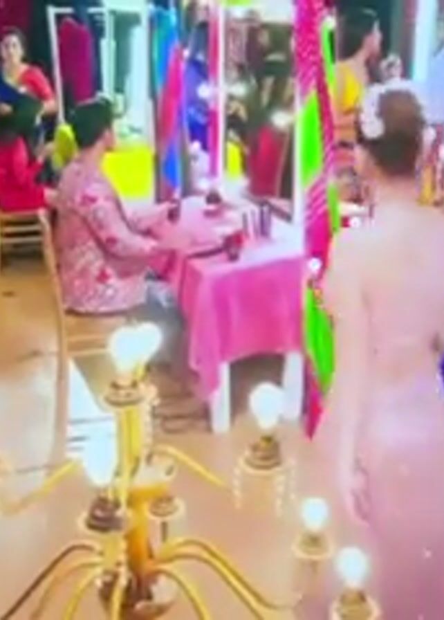 bustling backstage area with people getting ready for an event. A woman in a pink dress walks through the room past a chandelier, makeup tables, and racks of clothing. Another woman with a yellow dress and earrings stands near a woman with braided hair and a pink dress. The second woman is looking downward. Several other people are moving around in the background. The environment is crowded and filled with colorful decorations and clothing.