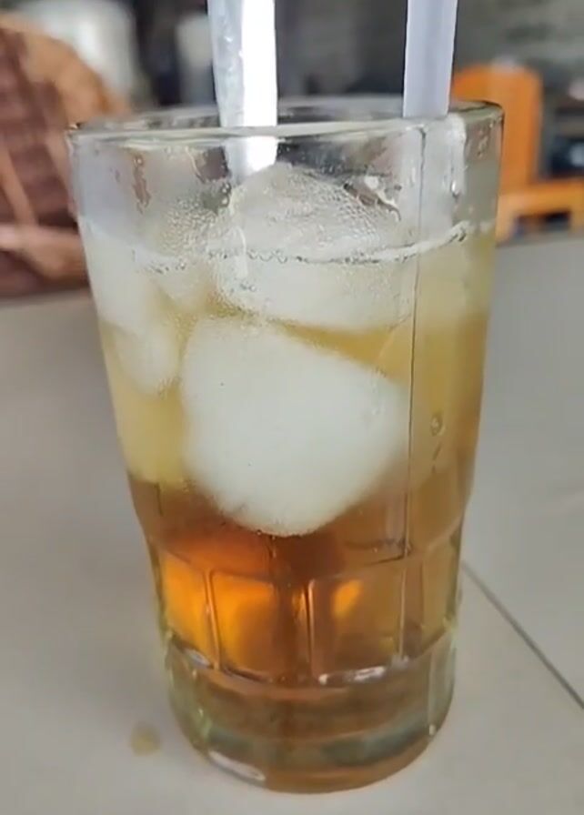 glass of iced tea on a white table. The glass is clear and has a paneled design. It is filled with a dark amber liquid, likely tea, and several large ice cubes. There are two white plastic spoons sticking out of the glass. The glass is sweating, indicating that it is cold. The background is blurry, but it appears to be an outdoor or semi-outdoor setting, possibly a café or restaurant. A person is partially visible in the background.