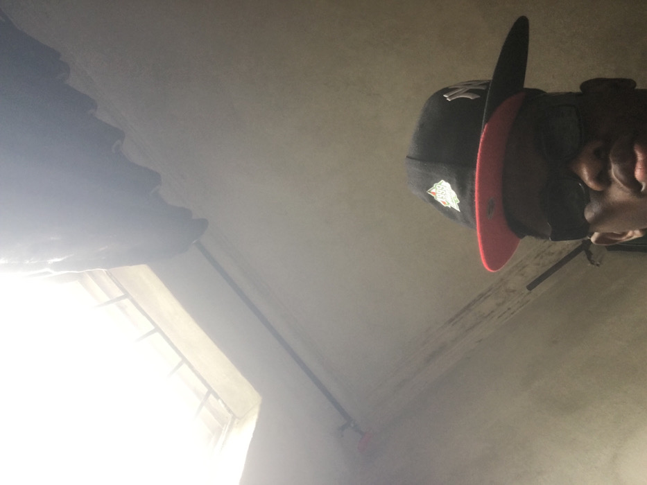 The image depicts a close-up, low-angle portrait of an individual situated within an indoor environment in Lekki, Nigeria. The subject, an individual with dark skin, occupies the lower half of the frame. They are wearing dark-tinted sunglasses and a black baseball cap with a red brim, positioned slightly askew. The cap features a white "NY" (New York Yankees) logo on the wearer's right side and a circular "1999" commemorative logo on the front left. The background consists of light-colored walls and a ceiling, exhibiting areas of discoloration, streaking, and what appears to be grime, particularly in the upper right and along the upper left wall. An intensely bright, overexposed light source, identifiable as a rectangular window or skylight with internal bars, is visible in the upper left corner, casting significant illumination and creating a high-contrast scene. A dark, irregularly shaped object, possibly fabric or debris, hangs from the ceiling in the upper right quadrant. A thin, dark rod-like object, likely a pipe or conduit, is affixed diagonally to the wall extending from the lower left towards the frame's center. No other individuals or discernible actions are present.
