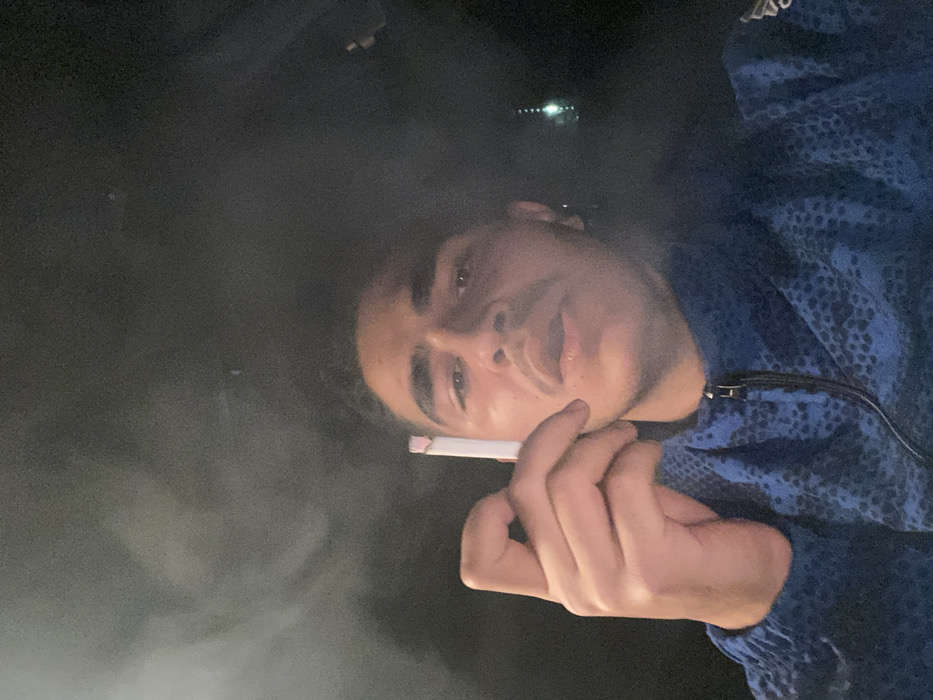 This image depicts a single male individual, identified as being in Ma'raba, Syria, captured from the chest up in a dimly lit environment. The subject directly faces the camera, exhibiting dark hair, prominent eyebrows, a mustache, and an olive complexion, with his mouth slightly ajar. His right hand is raised, holding a white smoking device with a pink tip, consistent with a vape pen or cigarette, between his thumb and index finger. Wisps of white smoke or vapor are visible in the upper left quadrant of the frame, indicating recent exhalation. The individual is dressed in a blue zippered jacket featuring a dark, textured, possibly reptilian, patterned design. The background is predominantly dark and indistinct, with a faint, vertical, green-tinged light source or reflection discernible in the upper right portion of the frame.