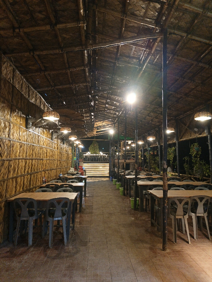 An indoor restaurant space with rows of dark wooden tables and chairs, extending into the distance. The structure is made of bamboo, creating a rustic and textured ambiance. Lights are hung above each table. The floor is brick and there is a brightly lit area in the distance, possibly an elevated stage. Green trash cans are visible next to each table.