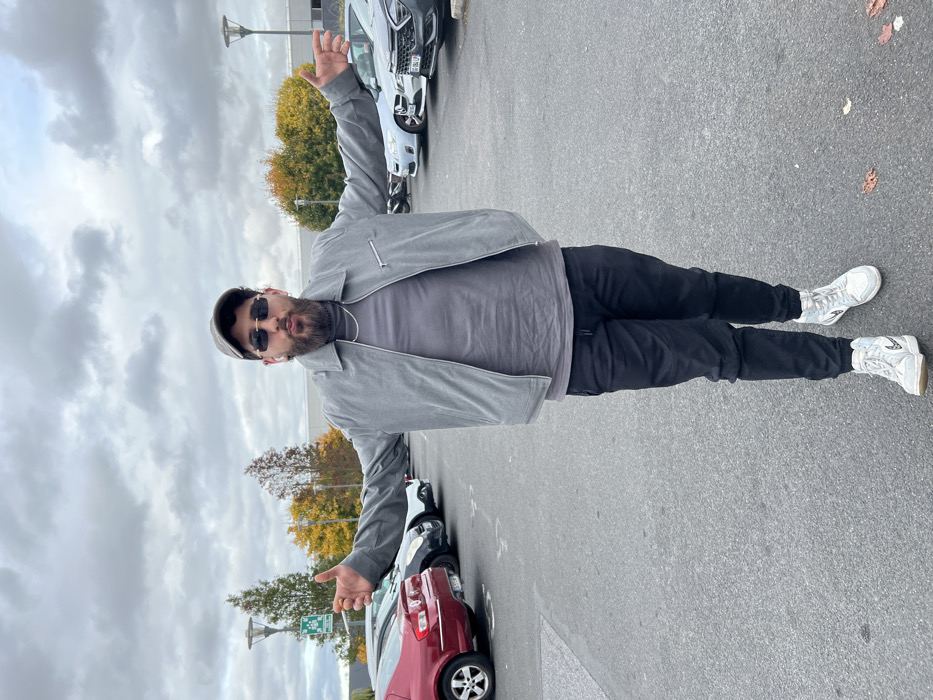 An adult male stands centrally in a paved outdoor parking lot in Stains, France. He faces the camera with both arms outstretched to the sides, palms open, and his lips pursed. He wears a grey baseball cap, dark rectangular sunglasses, a full dark beard, a light grey collared jacket over a darker grey crew-neck shirt, black jogger-style pants, and white high-top sneakers. A thin silver-colored chain is visible on his neck. The background consists of a parking area with multiple vehicles, including a red sedan on the left and a white Mercedes-Benz and a dark SUV on the right, some displaying French license plates from the Seine-Saint-Denis department (93). Trees with autumn foliage (yellow and orange leaves) are visible behind the parked cars. Utility poles, a white and green directional sign on a pole, and parts of a large, light-colored commercial or industrial building are also present. The sky is overcast with grey clouds. Scattered fallen leaves are on the asphalt in the foreground.