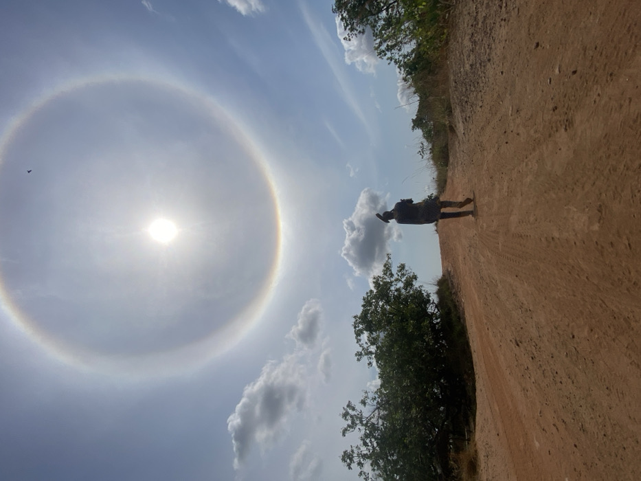 The image depicts an outdoor rural scene under a clear sky in Ufueseni, Nigeria. The dominant feature in the sky is a bright solar halo encircling the sun, which is centrally positioned in the upper half of the frame. Scattered white cumulus clouds are visible, primarily on the left and right sides, below the halo. A small, dark bird is present in the upper right quadrant of the halo. A single individual, seen from behind, walks away from the viewer on a reddish-brown dirt road that curves slightly uphill towards the horizon. The person wears dark-colored clothing and carries a dark, elongated object, possibly a tool or implement, over their right shoulder. Tire tracks are discernible on the surface of the dirt road. Green trees and dense foliage line the left side of the road, extending into the midground, while sparser, drier vegetation and shrubs are present on the right. The overall impression is one of a bright, sunlit day with a single figure traversing an unpaved rural path.