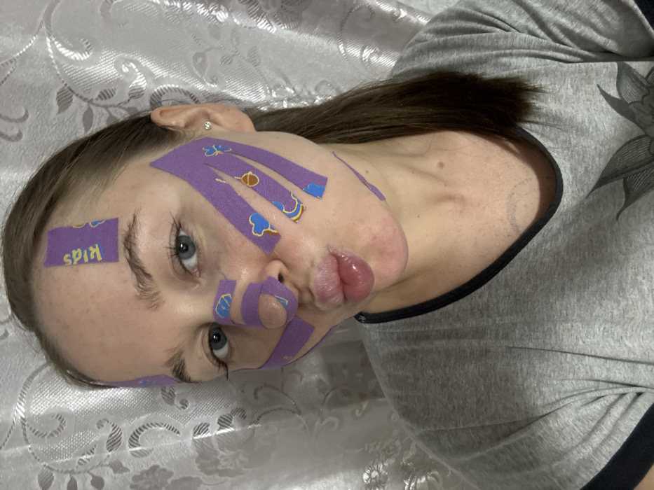 A woman lies on a patterned surface wearing a gray shirt with black trim. Purple tape with blue and tan designs is applied to her face, specifically on her forehead, eyebrows, nose, and cheeks. The tape on her eyebrow reads "Kids Spin." Her hair is brown, and she has an earring in her ear. Her lips are puckered and slightly protrude. Part of a tattoo is visible on her shoulder.