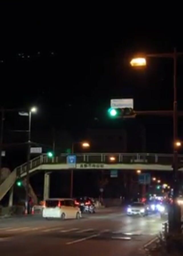 street scene at night. Cars are driving on the road, and traffic lights are visible, including a green light. A pedestrian overpass spans the road with signs. The sky is dark. Streetlights illuminate the area.