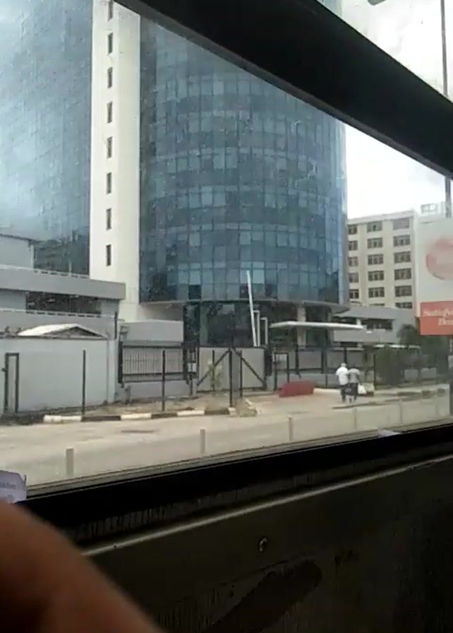 view from inside a vehicle, likely a bus, looking out of a dirty window. The view is of a city street with sidewalks and a building with a blue glass facade, and an advertisement for "Satisfying Banking". There's another taller building in the distance and some trees lining the road. Two people are walking on the sidewalk. The camera appears to be slightly tilted, giving a somewhat skewed perspective.