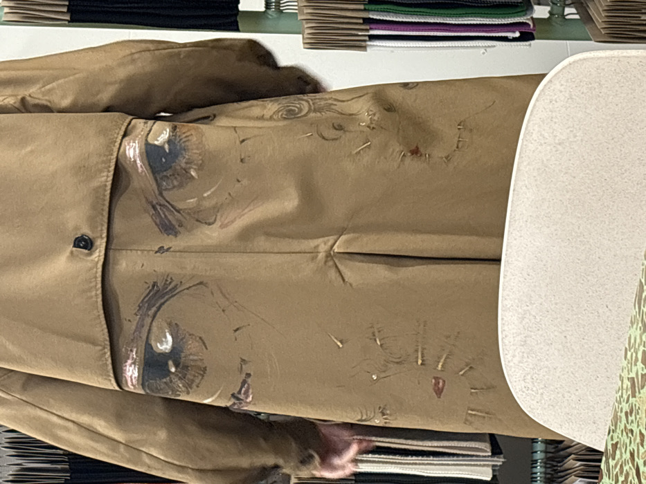 A tan-colored, full-length overcoat is depicted from the back, worn by an individual whose left hand is partially visible. The coat's back is extensively decorated with applied artwork. Two large, stylized human eyes, featuring brown irises and white highlights, dominate the upper section. Below these, additional abstract elements are present: on the lower left, a motif resembling red lips with radiating lines; on the lower right, spiral patterns, rough stitching, and areas with reddish accents. Thin, linear elements are scattered across the lower coat. The garment incorporates an upper back flap secured by a single dark button. The background features vertical racks displaying numerous textile swatches in various colors and textures, indicative of a design studio or showroom. A light-colored chair back is partially visible in the foreground, with a green and brown patterned surface beneath it. This scene is located in the city of Paris, France.