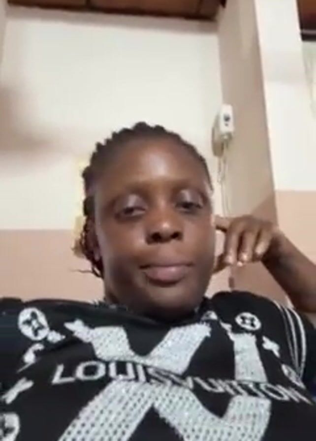 A woman is sitting, looking at the camera. She is wearing a black t-shirt with white designs and text that reads "LOUIS VUITTON". Her hair is styled in small braids. She has her right hand resting on her cheek. Behind her is a white wall with a brown stripe near the bottom. There is an electrical outlet on the wall and a light fixture on the ceiling. Loud ambient noise is present.