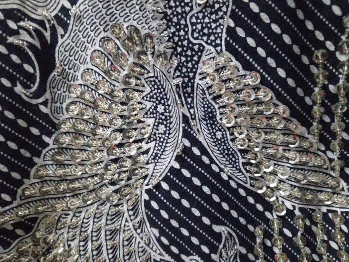 This image presents a close-up, top-down view of a textile, identified as being located in Batheay, Cambodia. The fabric features a dark blue background extensively patterned with white or light grey motifs. The dominant design consists of stylized, curvilinear patterns resembling feathered wings or intricate floral elements, interspersed with dotted lines and small geometric shapes. Superimposed on and adhering to these white patterns are numerous small, circular, reflective silver-toned sequins, meticulously arranged to highlight the contours and texture of the underlying design. On the right side of the frame, multiple vertical strands of similar silver-toned beads or sequins hang down. The lighting produces discernible reflections on the embellishments. No individuals, actions, or interactions are present in the frame; the focus is solely on the embellished fabric.