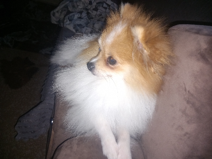 - "The image displays a small, bi-color dog, consistent with a Pomeranian breed, situated indoors in what is presumed to be Salibauri, Georgia" by FM-AY6mW2, licensed under CC BY 4.0