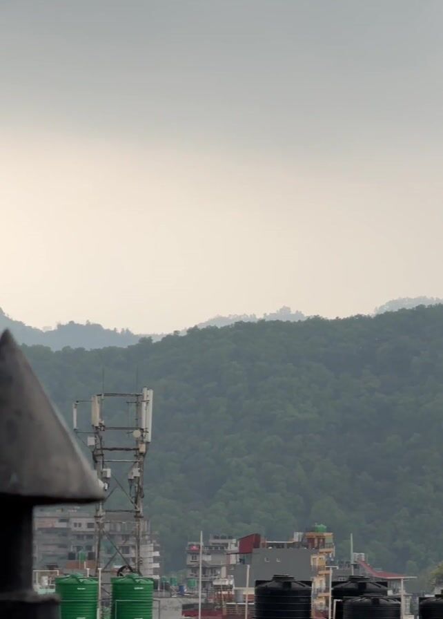 cityscape with mountains in the background under an overcast sky. The foreground features rooftops of buildings with various structures, including water tanks, antennas, and a vent. The buildings are a mix of colors and styles. The mountains in the distance are covered in green trees and are partially obscured by mist or haze. The sky is uniformly grey.