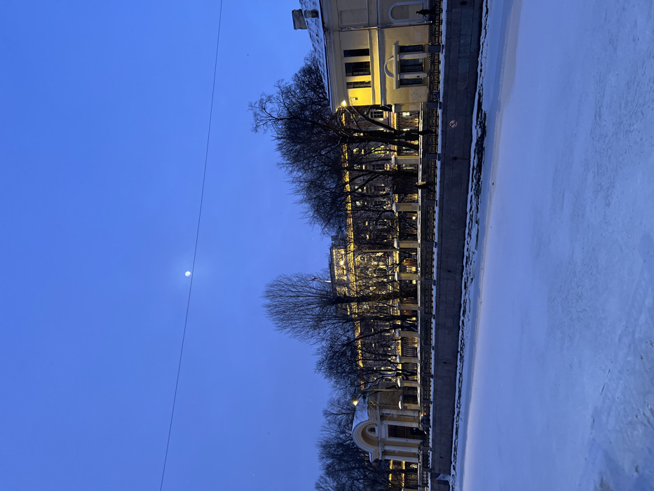 A city scene at dusk features buildings illuminated along a canal, lined by bare trees. The canal is covered in ice. A power line stretches across the blue sky, intersecting a distant moon. The perspective is tilted, presenting a view where the canal runs vertically. The buildings showcase a blend of architectural styles, uniformly lit and creating warm glow, contrasting with the cold icy blue scene.
