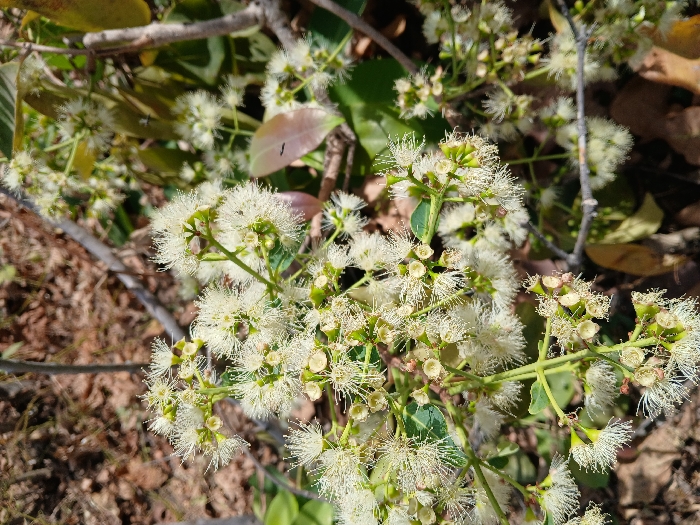 This image, taken in Mista Ali, Nigeria, shows a close-up, high-angle view of a cluster of small, white, fluffy flowers on a plant. The flowers are characterized by numerous thin, white stamens radiating from a central point, giving them a brush-like appearance. Some flowers exhibit small, green, cup-shaped structures at their bases. The plant's stems are light green, with a few small, green leaves visible. The background is out of focus, consisting of blurred brown and dark green foliage, suggesting a natural outdoor environment with dried leaves and twigs on the ground. Bright natural light illuminates the flowers, casting minimal shadows. No people or animals are visible, and no actions or interactions are depicted.