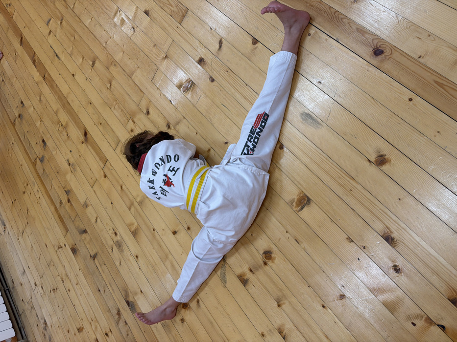 The scene is located in Kostinbrod, Bulgaria. A single individual is positioned on a light-colored wooden floor, performing a full front split. The person is viewed from behind, wearing a white Taekwondo uniform with a yellow belt tied around the waist. The back of the uniform's jacket displays "TAEKWONDO" in black capital letters above red Korean characters (태권도). The left pant leg features a logo that reads "VTRE TAEKWONDO". The individual's legs are fully extended forward and backward, and their torso is bent forward with their head lowered and forearms resting on the floor. Both feet are bare. The floor consists of light-toned wooden planks exhibiting visible grain and knots, arranged diagonally within the frame.