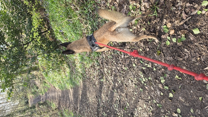 - "An outdoor scene in a wooded area within Magny-les-Hameaux, France, captures a fawn-colored dog, consistent with a Belgian Malinois type, standing on a dirt path" by FM-qBOnJ2, licensed under CC BY 4.0