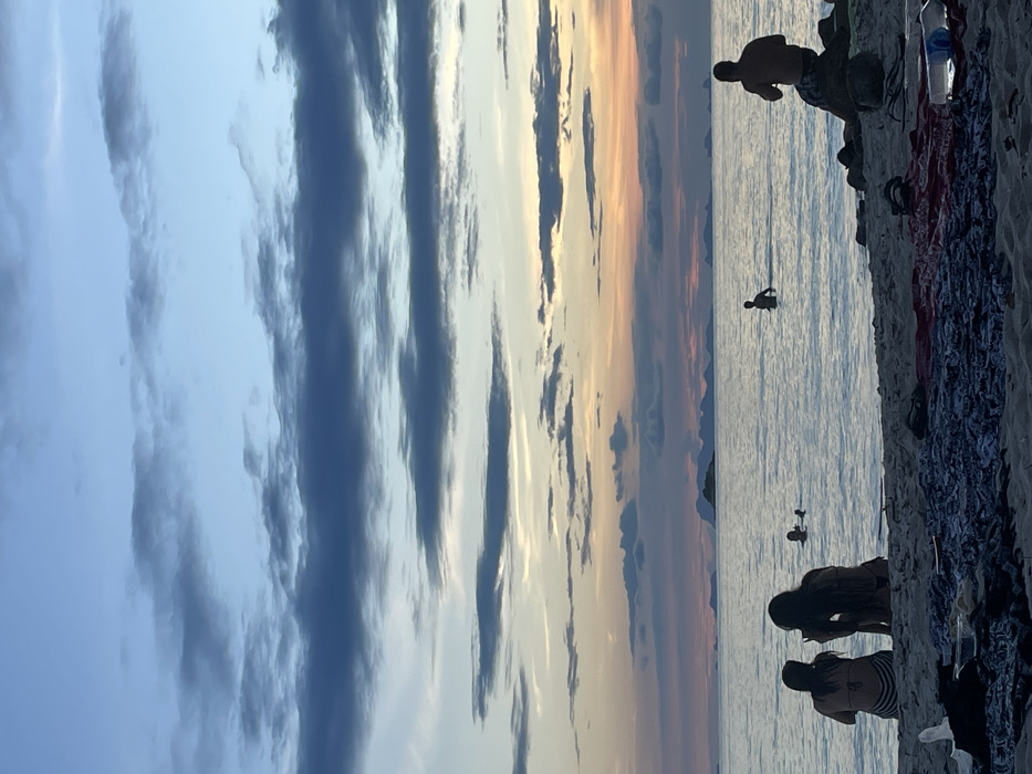 The image depicts a beach scene at sunset or twilight in Baan Sri Thanu, Thailand. The sky transitions from light blue at the zenith to hues of orange and pink near the horizon, populated by layered, dark grey clouds. The foreground consists of sand, where various items of clothing, including red and dark blue fabric, are scattered. A clear plastic water bottle is partially visible on the right. Five individuals are present, silhouetted against the bright water and sky. On the left, two female-presenting individuals with long hair are seated on the sand, facing the water. In the mid-ground, two individuals are wading in the calm, reflective sea; one is closer to the left, with only the head and shoulders visible, and another is further right, showing the torso and head. On the far right foreground, a male-presenting individual is seated on a dark rock or similar object on the beach, facing the water. Distant landmasses or islands are visible as dark shapes across the horizon above the water.