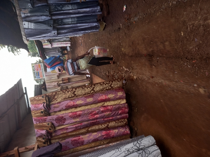 narrow, dirt alleyway in a market in Soweto, Tanzania. The alley is lined on either side with stalls selling fabrics, many of which are hanging from a ceiling. There is a single person walking down the alley, a woman carrying a bucket. There is a sign for "Wakala" visible. The ground is dusty and brown. The alleyway is narrow and crowded with stalls. The woman is wearing a striped shirt and has a white cloth wrapped around her waist. She is holding a blue bucket in her right hand and walking in the direction of the camera. The sign above the stalls reads "Wakala," and it appears to be a sign for a mobile money transfer service.