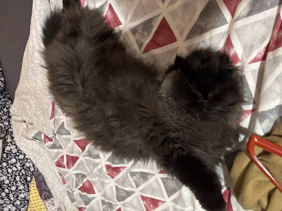 This image depicts an indoor scene on a bed in Balinovtsi, Bulgaria. The primary subject is a dark grey, long-haired domestic cat, lying supine and fully stretched out on a duvet cover. The cat's head is positioned towards the bottom center of the frame, facing slightly left. Its body extends upwards towards the top of the frame. The duvet cover features a geometric pattern composed of white, grey, and red triangles. In the upper left background, additional bedding is visible, including a dark fabric with a white floral pattern and a smaller section of yellow and purple patterned fabric. In the lower left foreground, a segment of tan-colored fabric is visible, along with a curved, bright red plastic or metal object. No people are present, and the cat appears to be at rest.