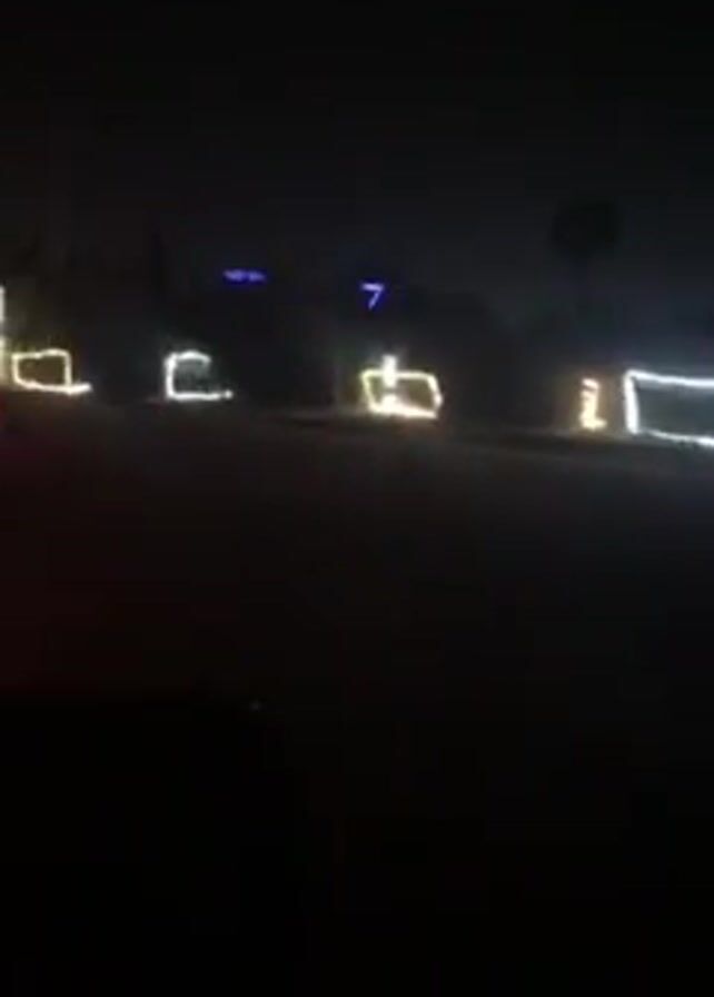The video depicts a nighttime scene from a moving vehicle. The camera is looking out at structures adorned with lights, which appear to be buildings or houses. The lights form outlines and vertical lines. Some lights in the distance are blue and green. The overall environment is dark.