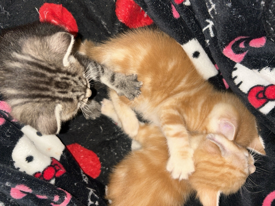 Three newborn kittens cuddle on a blanket patterned with Hello Kitty faces and red hearts. One kitten has gray fur with dark gray stripes and a white underbelly. The other two kittens are a ginger color, and appear to be sleeping. One ginger kitten is nestled beneath the first ginger kitten. The kittens look very small and helpless in the photograph.