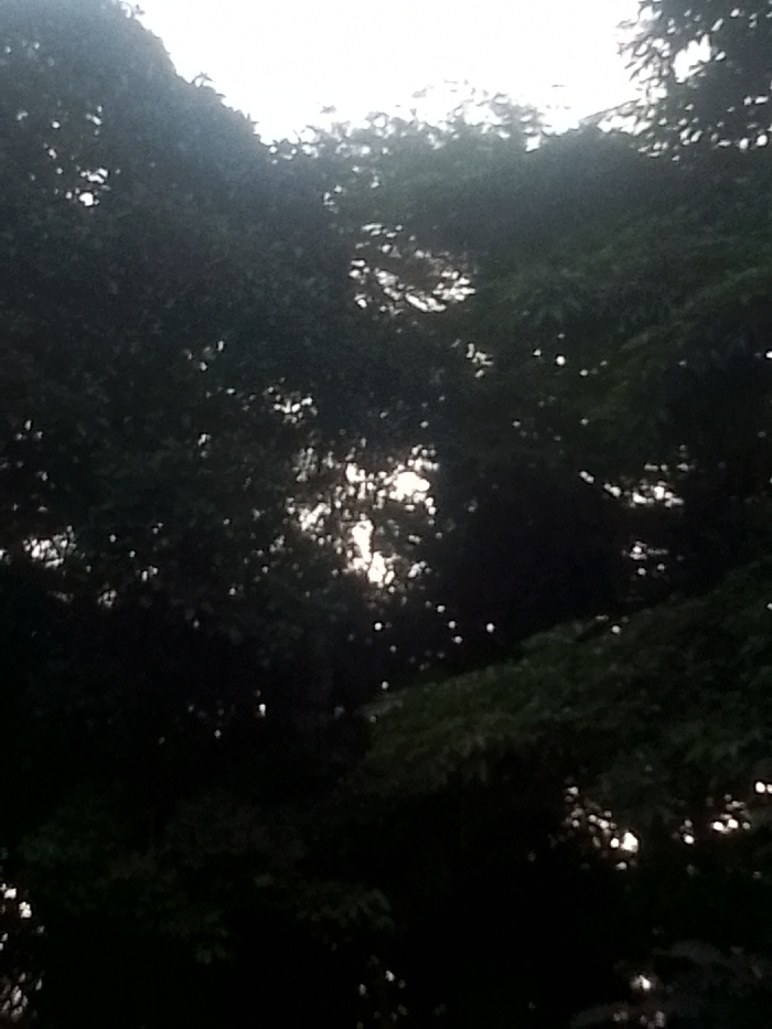 The image displays a dense arrangement of dark green to near-black foliage, comprising the majority of the frame. Bright, irregular patches of white light, indicative of sunlight or an obscured sky, penetrate through gaps in the dense tree canopy, particularly visible in the upper-middle and upper-right quadrants. Smaller, scattered points of light are also discernible amidst the shadowed leaves. No identifiable individuals, man-made structures, or specific actions are present. The environmental setting is consistent with a heavily vegetated outdoor area in Las Piedras, Venezuela.