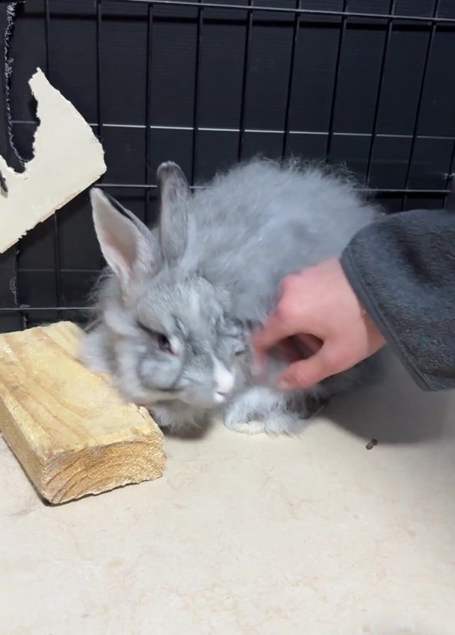 person petting a gray rabbit in what appears to be an indoor setting, possibly a rabbit enclosure or a room with a tiled floor. The rabbit is sitting next to a block of wood. The person's hand is seen briefly petting the rabbit's head and back. The rabbit seems calm and does not move away from the person's touch. In the background, there is a black wire cage.