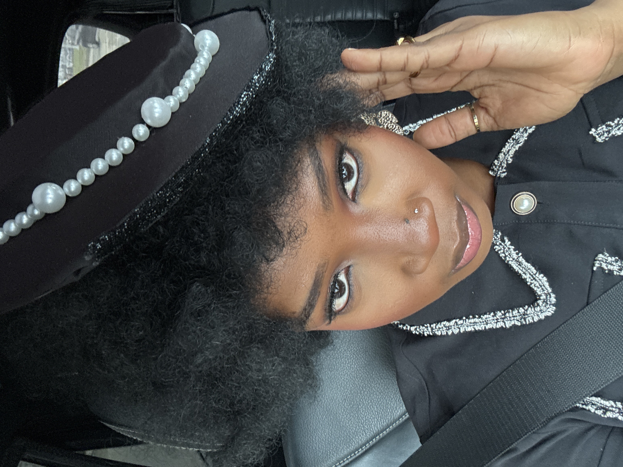 A medium shot depicts a woman in the front seat of a car, wearing a black hat adorned with pearls and a black jacket with silver trim. She has dark, curly hair and a nose piercing. Her hand is raised near her forehead, and she is wearing gold rings. The car's seatbelt is visible across her chest. The background appears to show an urban environment, possibly in Igboefon, Nigeria.