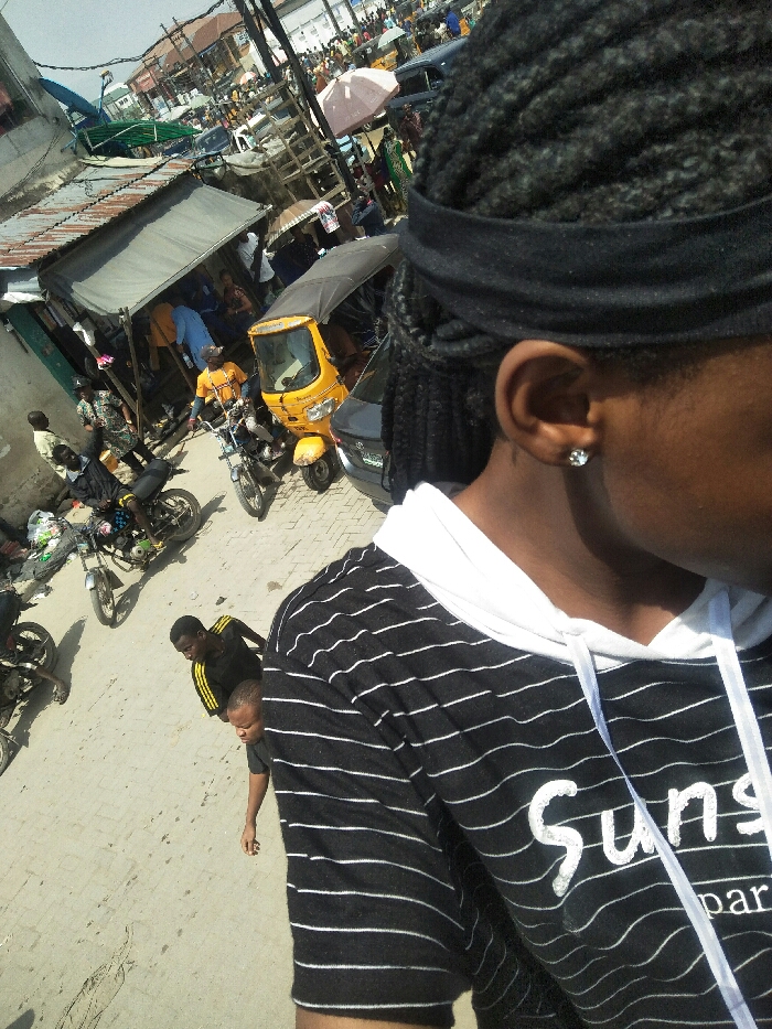 This image presents a street-level scene in Ajah, Nigeria, observed from a slightly elevated, first-person perspective. The foreground features the right side of an individual's head and upper torso. This person has dark, braided hair secured by a black headband. A single, clear stud earring is visible in the right earlobe. The individual wears a black short-sleeved hooded shirt with thin white horizontal stripes and white drawstrings; the partial word "Sunset" is visible on the chest. The midground depicts a paved street or pathway. Several individuals and vehicles are present. Two motorcycles are parked or in motion; one on the left has a person seated on it, while another in the center has a person in an orange shirt. A bright yellow motorized tricycle (keke napep) is situated behind this motorcycle, adjacent to a dark-colored sedan. Multiple pedestrians are seen, including one male in a black shirt with yellow arm stripes walking towards the bottom center, and another male partially visible beside him. To the left, several market stalls with corrugated metal roofs and temporary awnings are active, with people inside and around them. The background shows a densely populated urban environment, indicative of a busy market. Numerous people are clustered across the street. A single light-colored, open umbrella is visible above the crowd. Utility poles and overhead wiring are present. The scene is illuminated by clear daylight.