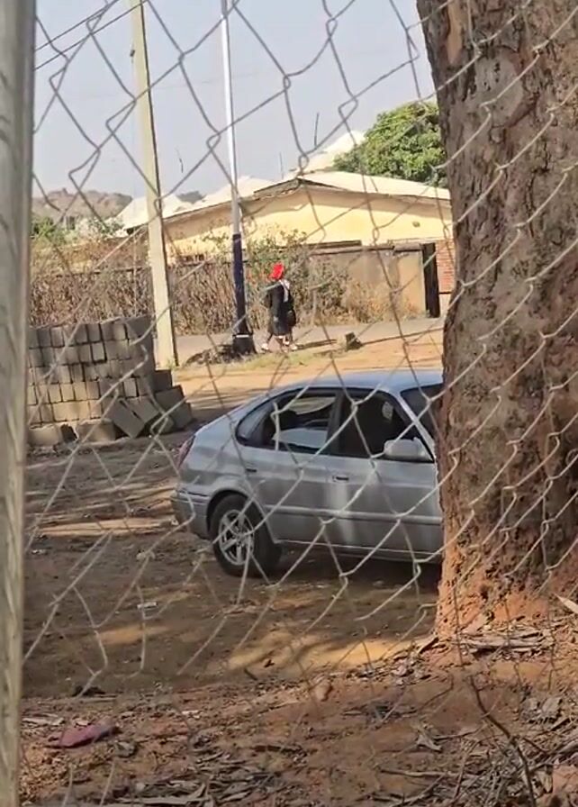 residential street scene, viewed through a chain-link fence. A silver car with an open driver's side door is parked in a dirt lot just behind the fence. Several stacks of concrete blocks are visible. A person wearing a red head covering and dark clothing walks along the street. A three-wheeled vehicle drives down the street in the same direction. Another silver sedan is parked further down the street. The sky is clear and the overall scene appears to be outdoors during daylight hours. A large tree trunk is visible on the right side of the frame.