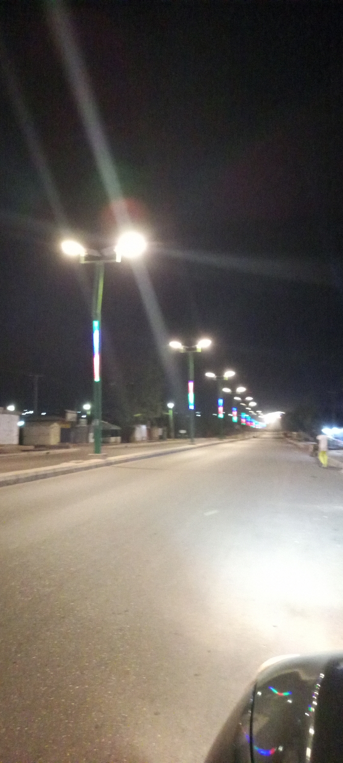 A night scene reveals an empty road illuminated by a series of streetlights. The lights are positioned along the roadside and feature colorful decorative bands. The road is wet, reflecting the light and creating a bright surface. The sky is dark and clear. A partial view of a car is visible in the foreground, with colored lights reflected on its surface.
