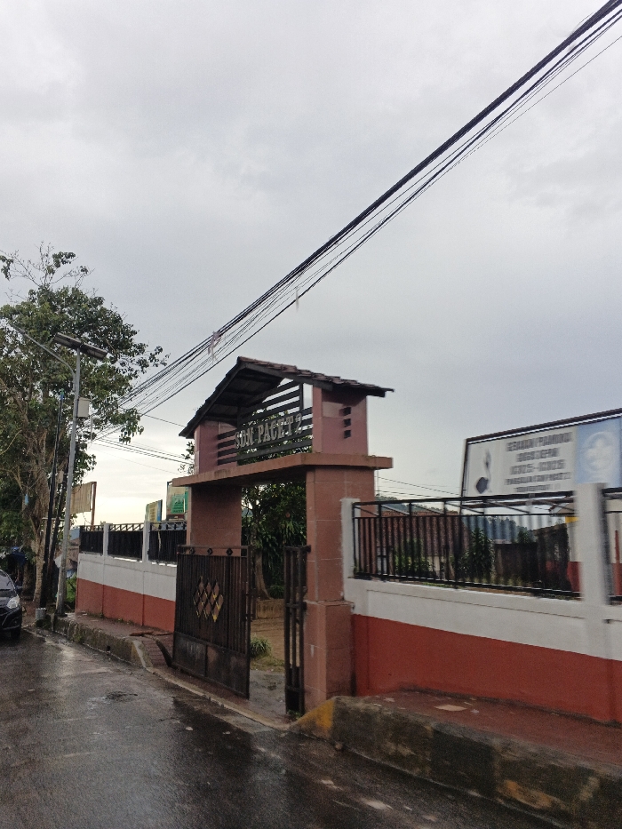 A street view of a school entrance under a cloudy sky. The school, named "SDN Pacet 2," features a red and white fence with a dark metal gate. Power lines stretch across the top of the frame. A streetlight and trees are visible to the left of the entrance. The ground is wet, suggesting recent rain. A sign identifying the school is partially visible behind the fence.