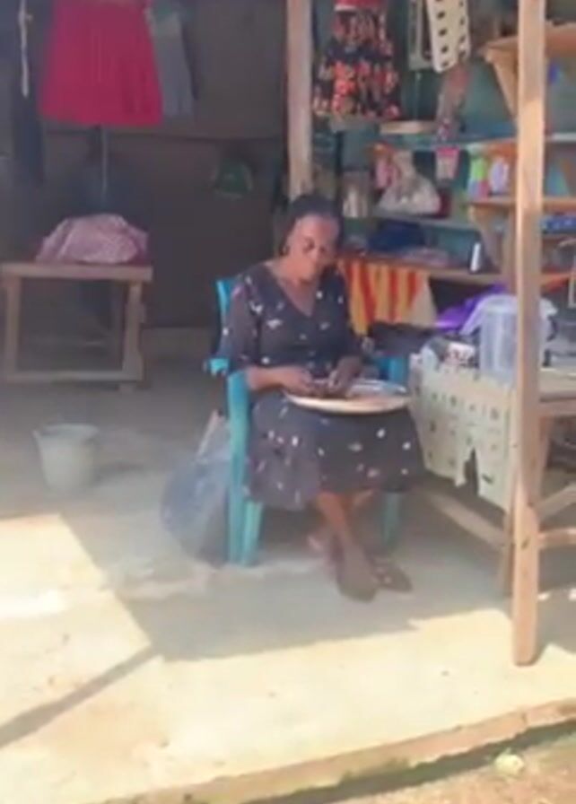 woman sitting on a blue plastic chair inside a small shop. The shop has a tin roof and concrete floor. The woman is wearing a black dress with a floral pattern and sandals. She is holding a silver tray on her lap and appears to be cleaning or preparing something. Behind her are clothes hanging, including a red dress and other items for sale. There's a wooden table, a bucket, and a plastic bag on the floor nearby. The shop is bathed in sunlight, and the area outside the shop appears to be a dirt road or pathway.