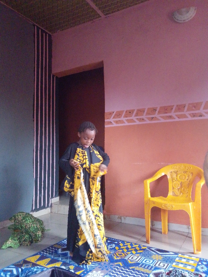 In a room located in Ankpa, Nigeria, a young child with braided hair, wearing a black long-sleeved garment, stands barefoot on a blue patterned mat. The child holds a piece of yellow and black patterned fabric, extending it vertically. To the child's left, two bundles wrapped in green patterned fabric rest on the tiled floor. To the right, a bright yellow plastic chair with a decorative backrest is positioned against a wall. The room features multi-colored walls: the wall to the left is dark grey with several vertical light-colored stripes, while the wall to the right is divided horizontally, with a light pink upper section and a reddish-orange lower section, separated by a white geometric pattern border. A dark doorway is visible behind the child, between the two wall sections. The ceiling is light-colored and appears textured, with a circular light fixture visible towards the upper right.