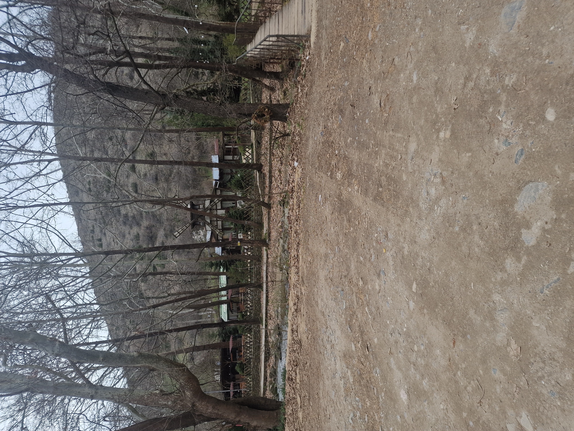 dirt path in Parvenets, Bulgaria, with a wooded area to the left. Bare trees line the path, and in the distance, a hillside is visible. A small stream or ditch runs parallel to the path, separating it from several buildings with what appear to be outdoor seating areas. There's a bridge partially visible at the top edge of the image. The scene appears deserted.