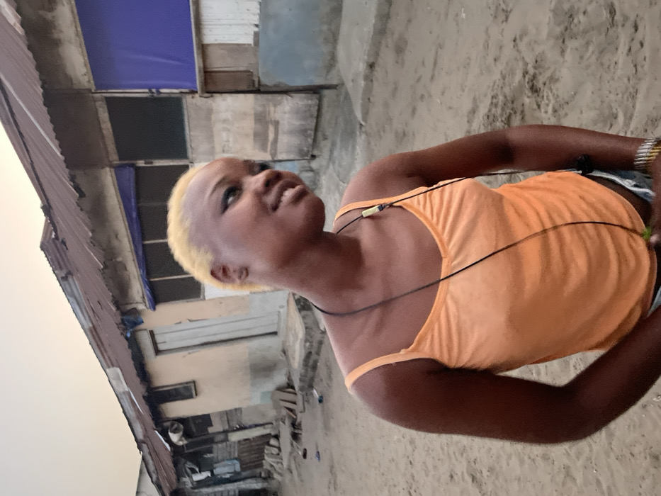 A woman with short blonde hair wears an orange tank top. A thin black cord is visible around her neck and across her chest. She looks up and to the left. Behind her, there are weathered buildings with a mix of corrugated metal roofs and concrete walls. A blue tarp covers a window. The ground appears sandy or dirt-covered. The scene has muted lighting, indicating it might be early morning or late afternoon.