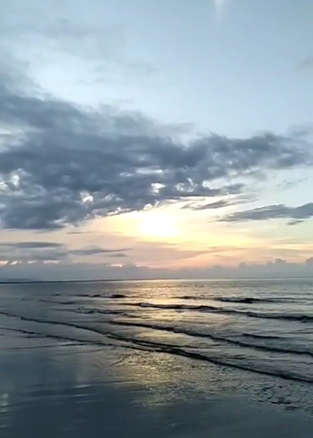 beach scene at sunset. The sky is filled with clouds, and the setting sun is visible through the clouds, casting a golden glow on the water. The waves are gently rolling onto the shore, and the wet sand reflects the sky and the sunset. There is no one visible on the beach.