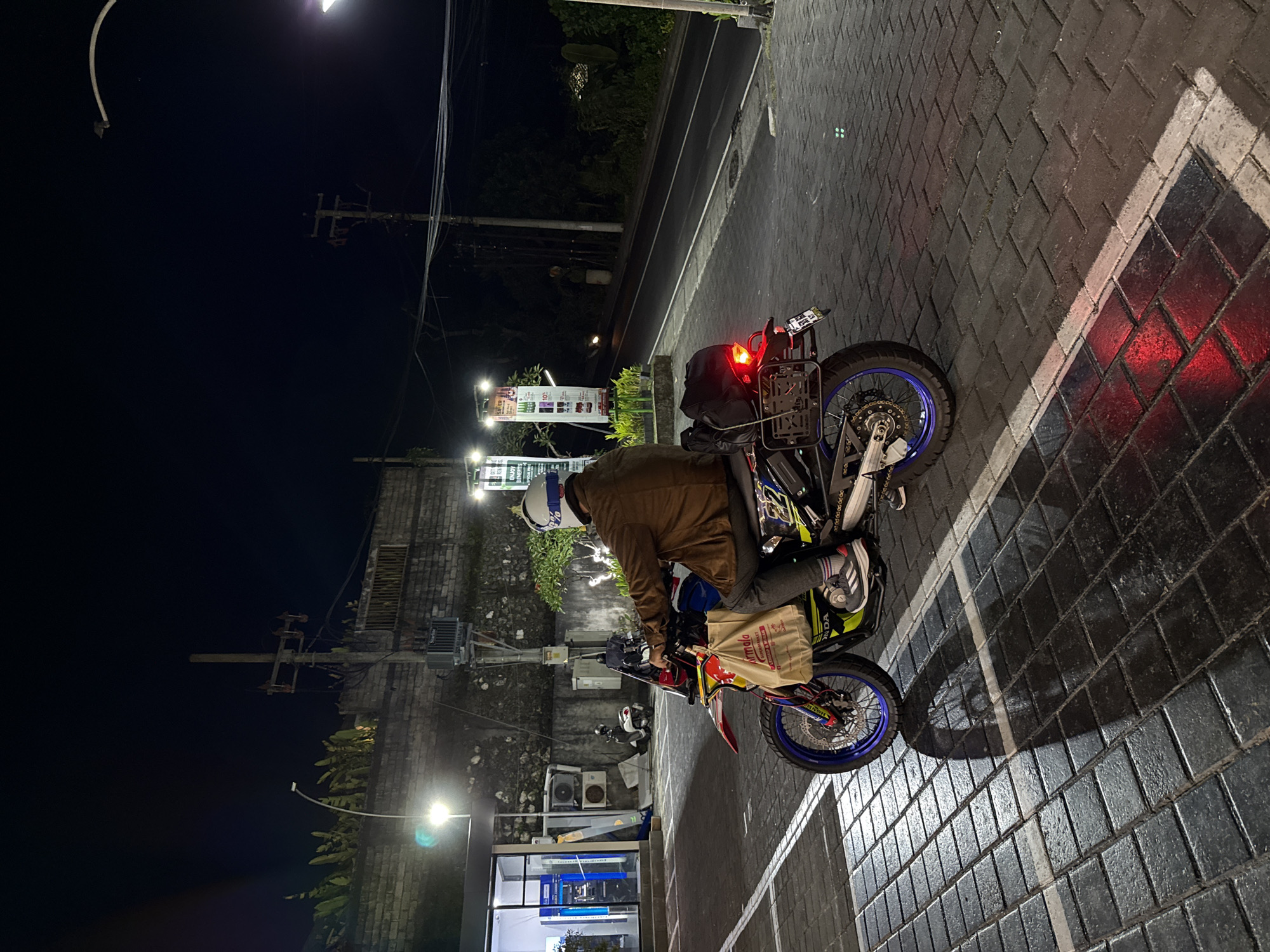 The image, taken at night in Kutuh, Indonesia, depicts a person on a motorcycle in front of what appears to be a convenience store or ATM kiosk. The motorcycle, with blue rims, has a bag hanging from the handlebars and a pack on the rear. The person is wearing a brown jacket, grey pants, athletic shoes, and a white helmet. The surface is brick, wet, and reflecting light. Power lines and street lights are visible in the background. A sign is near the convenience store.