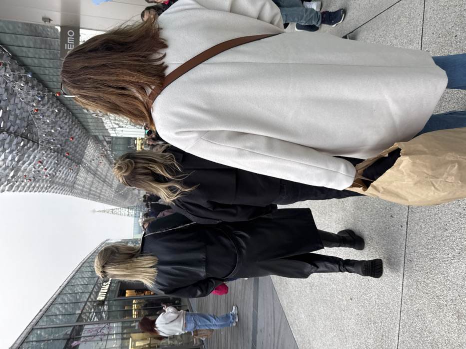 The image depicts an outdoor pedestrian shopping area within the Centre Commercial Steel in Saint-Jean-Bonnefonds, France, under an overcast sky. Three females are prominently featured in the foreground, walking away from the camera. The woman on the right has medium brown hair, wears a light cream-colored long coat, blue jeans, and carries a brown paper shopping bag in her left hand; a brown strap crosses her right shoulder. The central woman has blonde hair styled in a half-up bun, wears a black jacket, and dark trousers. The woman on the left has blonde hair in a similar half-up style, wears a long black faux-leather trench coat, black knee-high boots with visible ridged soles, and has a small pink bag on her left side. To the far left in the mid-ground, a person with reddish-brown hair, wearing a white long-sleeved top and light blue jeans, stands holding a white smartphone. Numerous other individuals are visible in the background, populating the walkway, indicating a busy environment. The walkway is paved with light grey material. Modern, multi-story, glass-fronted buildings line both sides of the thoroughfare. Store signs for "RITUALS" and "ĒMO" are visible on the left and right sides respectively. A distinctive, curved overhead canopy with a silver, textured, possibly corrugated or paneled surface extends along the entire visible length of the walkway. Red and silver Christmas baubles are strung beneath this canopy. In the distant center, a tall, illuminated, skeletal Christmas tree structure is visible. The sky is uniformly light grey, indicating cloud cover.