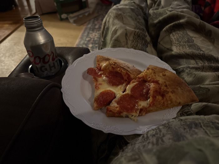 - "A casual scene shows two slices of pepperoni pizza on a white plate, placed near a can of Coors Light in a cup holder of a dark brown couch" by FM-jc1Mt1, licensed under CC BY 4.0