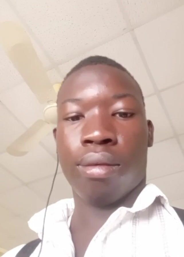 A young man is recording a video of himself from a low-angle. The man has dark skin, a close-cropped haircut, and is wearing a white shirt. He has earphones plugged in. He briefly raises his hand to wave at the beginning of the video. A ceiling fan and a patterned ceiling are visible in the background.