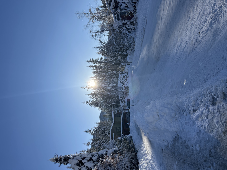 A winter landscape shows a snow-covered road leading past a house nestled amongst snow-laden trees. The bright sun shines through the trees, creating a stark contrast between light and shadow. The clear blue sky offers a vibrant backdrop to the snowy scene. The road appears to be freshly plowed, with high banks of snow on either side. The scene evokes a sense of peaceful isolation.