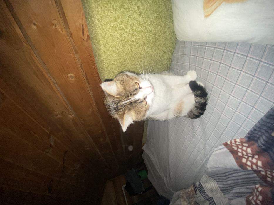 - "A domestic cat is depicted sitting on a bed in a dimly lit indoor setting, located in Прикамский, Russia" by FM-tUrX33, licensed under CC BY 4.0