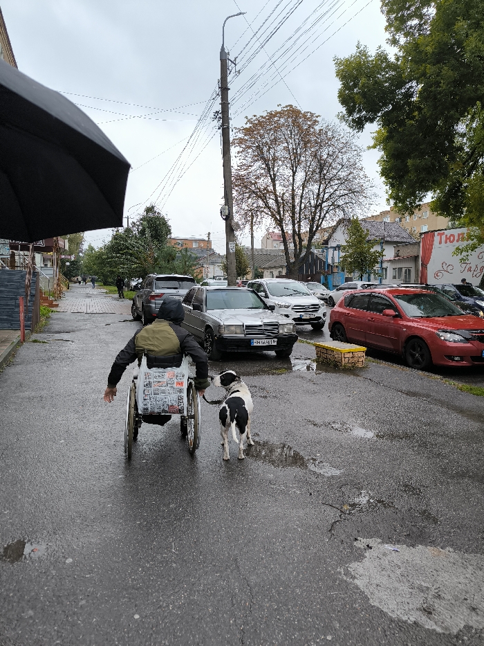 The image displays an overcast street scene in Vinnytsia, Ukraine, characterized by wet asphalt and numerous puddles, indicative of recent rainfall. In the foreground, an individual is observed from behind, seated in a manual wheelchair. The person wears a dark hooded jacket with an olive-green upper portion and is actively self-propelling the wheelchair. The backrest of the wheelchair is covered with black-and-white printed material, resembling newspaper clippings. A medium-sized dog, predominantly white with irregular black patches (including its ears and parts of its body), walks on a black leash held by the person in the wheelchair. The dog is positioned to the right and slightly ahead of the wheelchair. To the left, an elevated paved sidewalk is visible, with several pedestrians in the distance. The extreme left edge of the frame is partially obscured by a dark, open umbrella. The right side of the street features multiple parked vehicles. These include a red Mazda 3 hatchback with black wheels, a white SUV (possibly a Hyundai Tucson), and a silver Mercedes-Benz W124 sedan displaying Ukrainian license plate 'HM 5691 HI', which is specific to Vinnytsia Oblast. Further back, a dark SUV is also parked. Adjacent to the parked cars, a low, yellow-painted concrete or stone barrier is present. In the mid-ground, a tall utility pole with numerous overhead power and communication lines stands prominently. Buildings line both sides of the street, displaying various architectural styles. On the right, a building features a large red banner with partially visible Cyrillic text, likely "Тюльпан". Deciduous trees, some with green foliage and others exhibiting autumn colors (brown and orange leaves), are interspersed throughout the urban landscape.